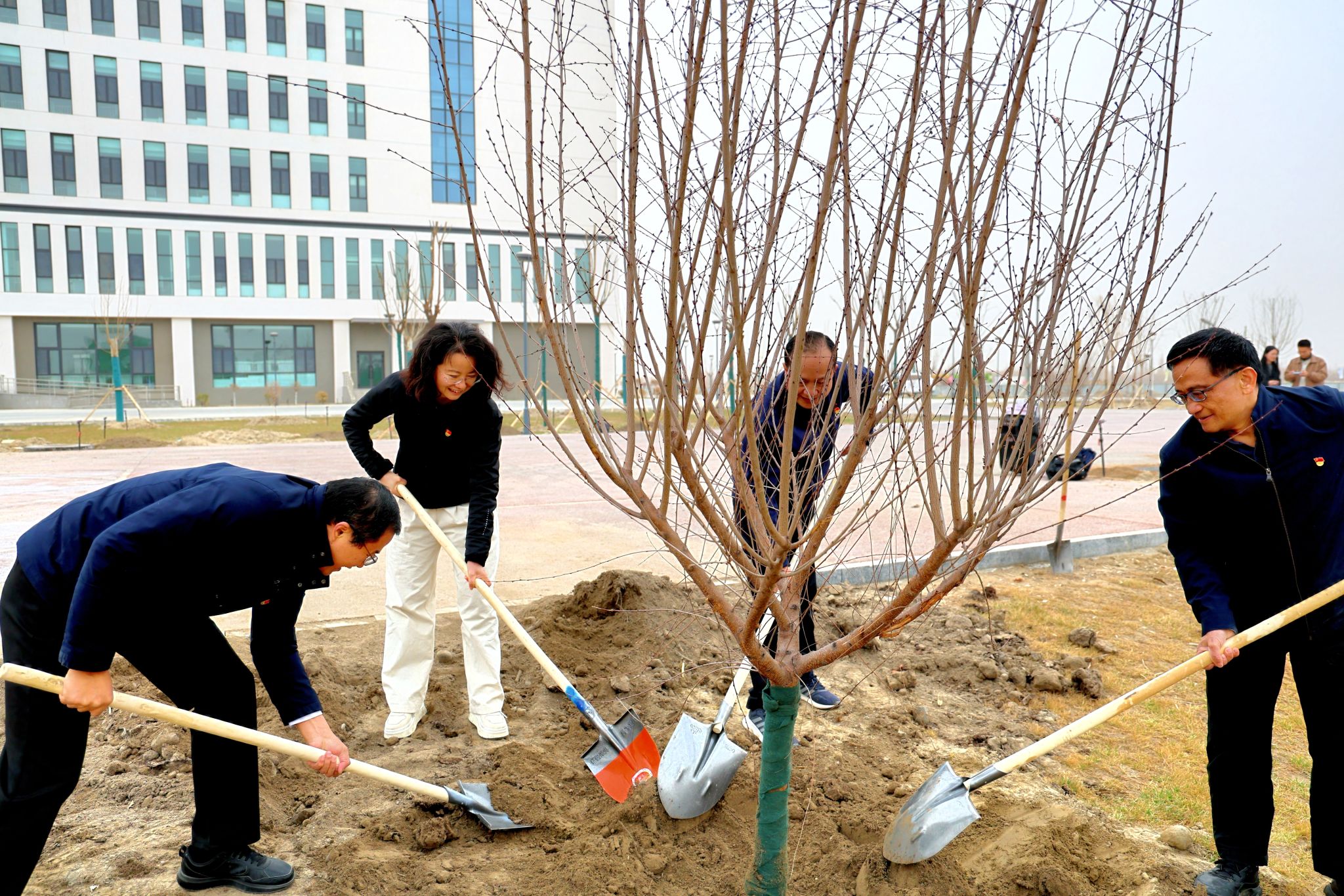 在大家的共同努力下,校领导与广大教师共种植山桃、紫叶李、山杏、樱花等树木近600棵。新栽种的树苗在微风中轻轻摇曳,在阳光的照耀下焕发出勃勃生机,它们整齐排列,宛如守护校园的卫士,为新疆工业学院增添了一道靓丽而充满希望的风景线,也为校园未来的生态环境描绘了一幅美好的蓝图。